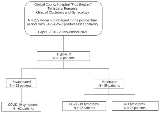 Flowchart of the cross-sectional data collection in this exploratory analysis. 272 women with a positive PCR RT test for COVID-19 were discharged in their postpartum period from the Department of Obstetrics Clinical County Hospital of Timisoara throughout the research period (1 April 2020–20 November 2021). In every instance, testing for the SARS-CoV-2 infection took place prior to delivery. There were 97 suitable patients left after the exclusion criteria were applied (the presence of multiple pregnancies, gestational age at birth less than 24 weeks, and unclear immunization status against SARS-CoV-2 infection). Out of these, 35 patients were immunized against COVID-19 disease, while 62 patients were unvaccinated (all of them developed symptoms), and 12 of the vaccinated individuals showed signs of infection at the time of birth, whereas the remaining patients were asymptomatic.