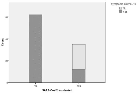 Overall, the difference in proportion of symptoms was highly significant: Monte-Carlo-simulated chi-square test, p < 0.0001. Figure 2 illustrates the distribution of the patients in the two groups corresponding to the vaccination status, with their respective number of symptomatic and asymptomatic cases.