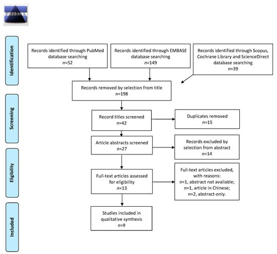 - Moher, D.; Liberati, A.; Tetzlaff, J.; Altman, D.G. Preferred reporting items for systematic reviews and meta-analyses: The PRISMA statement. Ann. Intern. Med. 2009, 151, 264. [Google Scholar] [CrossRef]