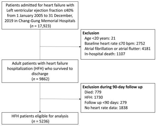 From the CGRD, we retrieved the records of patients admitted for decompensated heart failure with a left ventricular ejection fraction (LVEF) of ≤40%, from 1 January 2005 to 31 December 2019. The index date was the date when each patient was discharged after index heart failure admission. Each patient’s LVEF was determined on the basis of the echocardiography report generated during the index admission. Each patient’s baseline heart rate was defined as their first heart rate recorded after the index admission. The first recorded heart rate at admission is the condition before medications or treatments for heart failure control. Each patient’s follow-up heart rate was defined as their heart rate recorded at the 3-month screening period in the outpatient department. Clinically, physicians may frequently adjust the medication and treatment for a short period after discharge. It was noted that the medications prescribed for heart failure were less changed until a period of 2–4 months after discharge. Thus, we chose the 3 months after discharge as the screening period. Patients were excluded if they were aged younger than 20 years, had a baseline heart rate of <70 bpm, had a diagnosis of atrial fibrillation or atrial flutter before or during the index admission, or did not survive to discharge. Patients who died, presented with heart failure exacerbation and required readmission before the 3-month screening period, had follow-up periods of <90 days, or lacked follow-up heart rate measurements, were also excluded (Figure 1). A total of 5236 patients with decompensated heart failure and an LVEF of ≤40% requiring hospitalization with follow-up durations of over 3 months were determined to be eligible for inclusion.