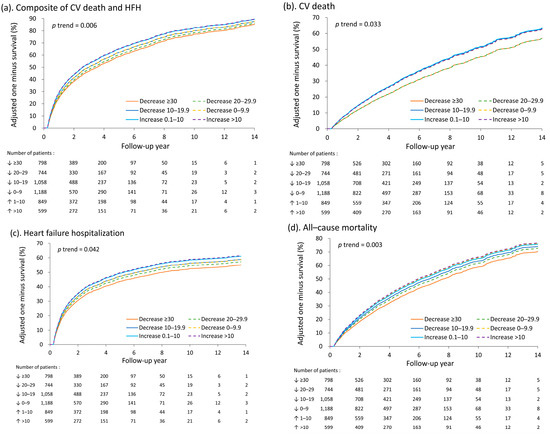 Heart rate control has been used as a treatment modality for heart failure for decades. As the standard treatment, beta blockers lower a patient’s heart rate, improve their sympathetic tone, reduce myocardial oxygen consumption, and control arrhythmia, resulting in more favorable clinical prognoses [13]. The beneficial effects of beta blockers strongly depend on their heart rate-reducing properties [27,28]. Ivabradine can be used to further reduce the heart rates of patients with HFrEF with sinus rhythm heart rates over 70 bpm, and help such patients achieve more favorable clinical outcomes, including a lower risk of mortality, especially when a patient’s heart rate can be reduced by ≥15 bpm [12,29]. One post hoc analysis of the EVEREST trial revealed that heart rates of ≥70 bpm after discharge are associated with an increased risk of mortality [23]. Nevertheless, heart rate reduction targets have rarely been discussed in the literature. Using our unadjusted models, we determined that a heart rate reduction of ≥20 bpm has significant benefits in terms of preventing the composite outcome of HHF and cardiovascular death. After adjustment for all covariates, the benefits remained significant. The overall mortality rate of the patients whose heart rates decreased by ≥30 bpm was significantly lower than that of the patients whose heart rates decreased by <10 bpm.