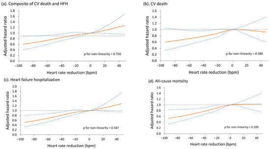 Since the cut-off values used to group the patients were subjective and arbitrary, we explored the possibility of a nonlinear relationship between changes in heart rate and risk of outcomes by treating heart rate reduction as a flexible restricted cubic spline. The locations of knots were set to the 5th, 35th, 65th, and 95th percentiles. We adjusted for the covariates in the restricted cubic spline model. Since our data set had some missing values, the Cox models (including the restricted cubic spline model) were calculated using the complete data after single expectation–maximization imputation. R (version 4.0.4, R Project for Statistical Computing) and the “rms” package (version 5.1 to 3.1) were used to generate the restricted cubic spline model. SAS (version 9.4, SAS Institute) was used for other statistical analyses. A two-sided p-value <0.05 was considered statistically significant.