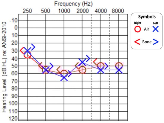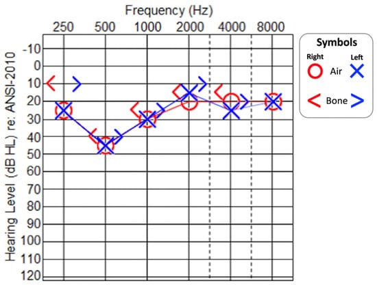 At 7 years of age, the patient underwent a complete audiological examination. Otoscopy was bilaterally normal. Pure-tone audiometry revealed mild-to-moderate sensorineural hearing loss at middle and low frequencies (500–1000 Hz) (Figure 1). Tympanometry was bilaterally normal (type A). Stapedial reflexes (SRs) were bilaterally absent at maximum stimulation levels. OAEs were successfully recorded; click-evoked and tone-burst-evoked ABRs on the left ear could not record any response whereas on the right side, an evident V-wave could not be recorded, even with a 95 dB SPL click stimulus.