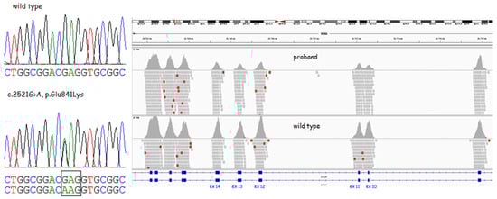 The c.2521G>A missense variant was validated using PCR-Sanger sequencing technology whereas the presence of the deletion was confirmed by array-CGH, which did not reveal any other clinically relevant genomic imbalances in the genome. The inheritance of these variants was then checked in the unaffected parents. The missense variant was inherited from the father. The presence of the deletion was not evaluated because the samples of the parents were not available for an array-CGH analysis.