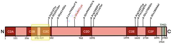 The c.2521G>A, p.Glu841Lys variant, which occurred in exon 21, resulted in a glutamic acid-to-lysine substitution at position 841. It has previously been reported as a pathogenic allele [24,25] in association with auditory neuropathy spectrum disorder and it is classified as pathogenic in HGMD (Human Gene Mutation Database) (CM1513835) and the Deafness Variation Database, according to standard ACMG guidelines. This variant has a low allele frequency in the GnomAD database (0.0000066, rs772729658) and is well-conserved in several species; it is located between the C2C and C2D domains.