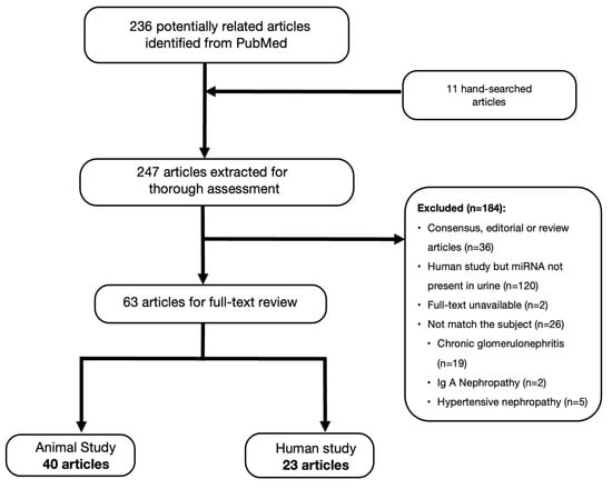 We identified 247 records from the PubMed database for the initial assessment, and only 63 articles were included for full-text review; 40 articles related to animal studies and 23 human research articles, respectively (Figure 1). This literature review included a thorough assessment of 41 miRNA from animal experiments and 141 miRNA from urine samples of DKD patients.