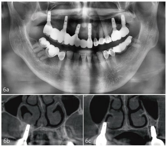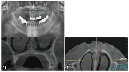 A 65-year-old female patient presented to a private dental office in Seoul, Republic of Korea, with a chief concern, to rehabilitate her posterior occlusion with the aid of dental implants. The patient self-reported as a non-smoker, with no systemic health conditions and no medications. Her medical and dental history were obtained, and the patient presented without any nasal or sinus-related symptoms. A physical head and neck examination was performed. Clinical examination revealed no intra- or extra-oral swelling or asymmetry. Past dental history revealed the loss of posterior upper right dentition due to periodontitis with concomitant vertical and horizontal bone resorption (Figure 1a) depicted in the panoramic radiograph. In comparison to the left dentate maxillary quadrant, the right maxillary bone height is significantly decreased due to vertical bone loss. The radiographic trace of the floor of the right maxillary sinus appears well-defined. However, subsequent cone beam computed tomography (CBCT) (PaX-i3D Smart, Vatech, Seoul, Republic of Korea) imaging depicts a closely positioned nasal cavity located directly apical to the ridge (Figure 1b). The coronal view clearly shows the most coronal portion of the maxillary sinus at the upper-left corner of Figure 1b, while the bucco–palatal dimension of the remaining ridge showed deficient lateral volume. The inferior meatus of the nasal cavity extended to the posterior maxilla and the lateral breadth appeared wide (Figure 1c).