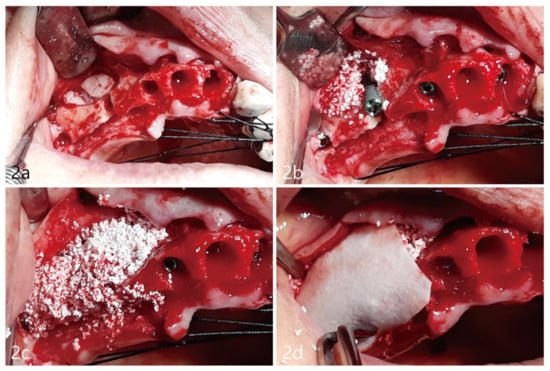 (a). A mucoperiosteal flap was reflected and an ovoid-shaped osteotomy was prepared on the buccal bone plate corresponding to the location of the inferior meatus. (b). Multiple fixtures were placed subcrestally, including an implant at site #4 implant. (c). Additional lateral bone augmentation was performed on both the buccal and palatal aspects. (d). An absorbable collagen membrane was placed at grafted sites to enclose the grafts.