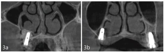 For post-operative management, medications were prescribed, including systemic antibiotics, Cefradine 500 mg twice a day for 14 days (Yuhan Pharmaceutical Co., Ltd., Seoul, Republic of Korea), and non-steroidal anti-inflammatory drug Anaprox 275 mg (Chong Kun Dang Pharmaceutical Co., Seoul, Republic of Korea), as needed. The patient was instructed to maintain oral hygiene with the use of 0.12% chlorhexidine solution (Hexamedine, Bukwang Pharmaceutical, Seoul, Republic of Korea) BID for 14 days. The patient was cautioned against expelling nasal mucus forcefully through her nose for 7 days and was also advised to keep the surgical area clean. Prior to her dismissal, a CBCT was acquired to obtain the post-operative view of the surgical procedure, including the location of the implants in relation to the inferior meatus (Figure 3a,b).