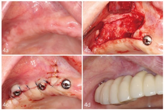 (a). Clinical photograph before uncovering of the fixtures. (b). New bone formation evident upon re-entry. A core was collected from an area away from the implants. (c). Placement of healing abutments and flap closures. (d). After 2 months of healing, a cementable final prosthesis was inserted.