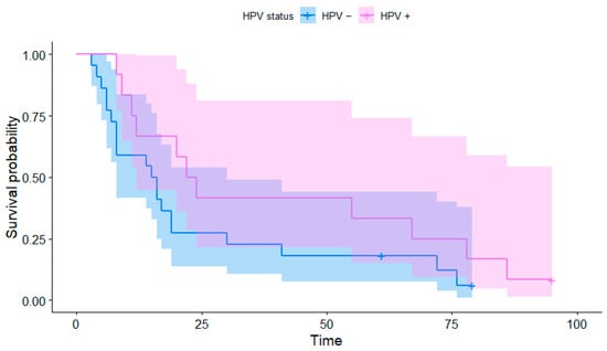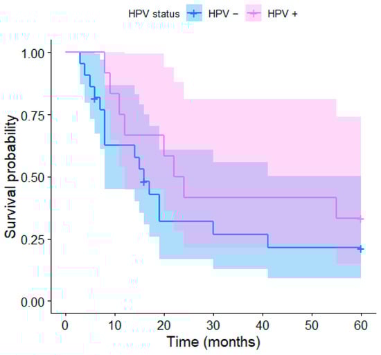 The median OS was 16 months (range 4–95 months, Figure 1 and Figure 2). The 2-year OS was recorded in 12 (35%) patients, of which 7 were HPV-positive (58% of HPV-positive patients) and 5 were HPV-negative (23% of HPV-negative patients). The 5-year OS was recorded in nine patients (26.4%), including four HPV-positive patients (33% of HPV-positive patients) and five HPV-negative patients (23% of HPV-negative patients). The Kaplan–Meier curve of the overall survival over 90 months depending on the HPV status of the individual patients is presented in Figure 1; the curves are visibly distinct, which shows a trend for better survival in HPV-positive patients, although their difference was not found to be statistically significant (p = 0.083). The same applies to shorter-term Kaplan–Meier curves of the 2-year (p = 0.083) and 5-year survival (p = 0.159) presented in Figure 2 and Figure 3, respectively.
