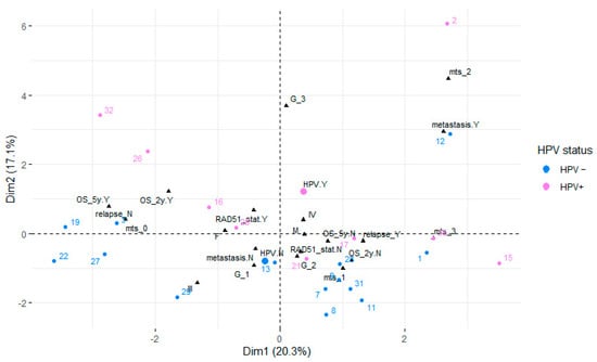 The factor analysis for mixed data identified the two first principal components accounting for 37% of the variance in the data. The variables GTVT+GTVLNs (gross tumor volume of tumor and gross tumor volume of metastatic lymph nodes) and GTVT were significantly positively correlated with the first principal component (20.3%), while the correlation with the overall survival (OS_months) was negative. Qualitative variables associated with this principal component included local relapse, 5-year survival status, 2-year survival status, and metastasis. Mitosis was positively correlated with the second principal component (17.1%). Qualitative variables associated with this principal component included tumor grading (G), metastasis, HPV, and 2-year survival status. The relationships between the variables, their particular categories in the case of qualitative variables, and the principal components are visualized in Figure 6 (HPV status of the individuals distinguished by color) and Figure 7 (RAD51 expression distinguished by color). In both cases, the individuals form rather distinct groups, differing mainly in their scores on the second axis (Dim 2).