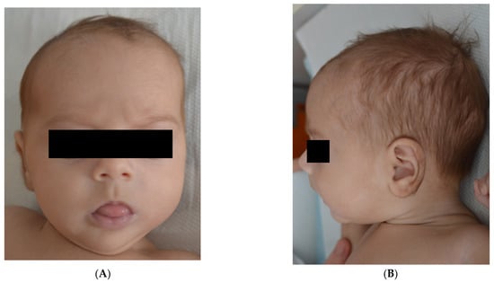 The current presentation was motivated by a fever (38 degrees Celsius) that started three days before being admitted and was accompanied by feeding refusal and accentuated paleness. Upon admission, the clinical status of the infant was severely compromised: severe tachypnea (80 breaths per minute), dyspnea, rhythmic tachycardia (180 beats/min), agitation, and peripheral oxygen saturation of 84%. The patient was initially tachycardic, but she became bradycardic immediately after mild sedation for central line insertion (before central venous catheter (CVC) insertion). The patient presents craniofacial dysmorphic features with downslanting palpebral fissures, frontal bossing and micrognathia, and muscular hypotonia (Figure 1).
