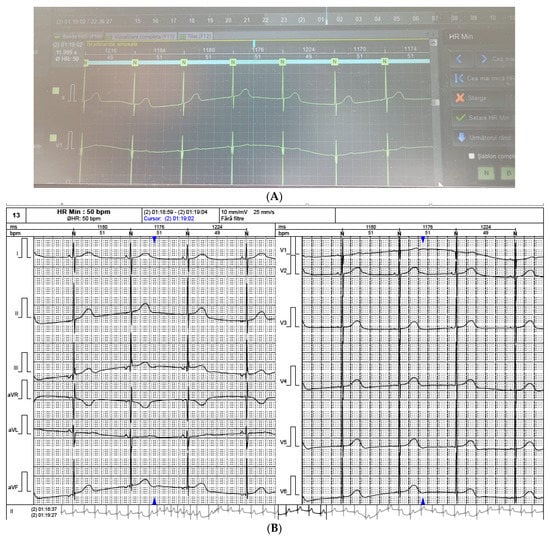 The ECG Holter 24 h monitoring showed a minimum heart rate of 49 beats/min and a maximum heart rate of 161 beats/min (Figure 2A,B). There were no ventricular pauses longer than 2000 ms and no ventricular or supraventricular arrhythmias.
