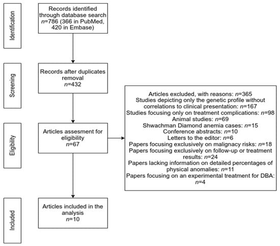 The process of the study selection is shown as a PRISMA flow diagram in Figure 3. Our electronic search retrieved a total of 786 records (366 in the PubMed database and 420 in Embase). After removing the duplicates, 432 papers were further screened by title and abstract analysis. Afterward, we excluded 365 papers due to the following reasons: studies depicting only the genetic profile without correlations to clinical presentation (167), studies focusing only on treatment complications (98), animal studies (69), Shwachman Diamond anemia cases (15), conference abstracts (10), or letters to the editor (6). The remaining 67 studies were further analyzed for eligibility by full-text reading. Finally, we have excluded the papers focusing exclusively on malignancy risk (18) or follow-up or treatment results (24), as well as papers lacking information on detailed percentages of physical anomalies (11) and papers focusing on an experimental treatment for DBA (4). In the end, we have analyzed 10 papers that provide insight into DBA cases, both from a clinical and genetic perspective (Table 1).