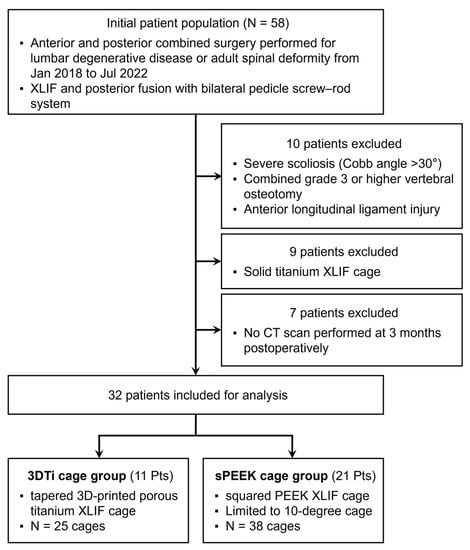 Patients with severe scoliosis (Cobb angle > 30°), those who underwent concomitant grade ≥ 3 osteotomies [], and those with intraoperative injury to the anterior longitudinal ligament were excluded. In addition, nine patients with solid titanium cages were excluded. For postoperative evaluation, computed tomography (CT) was performed at 1 week and 3 months postoperatively; seven patients who had not undergone CT scans at 3 months were excluded. Finally, a total of 32 patients (mean age 74.1 ± 6.7 years; 22 females and 10 males) were analyzed in this study (Figure 2).