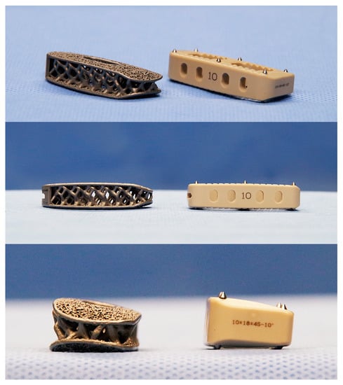 - Adl Amini, D.; Moser, M.; Oezel, L.; Zhu, J.; Okano, I.; Shue, J.; Sama, A.A.; Cammisa, F.P.; Girardi, F.P.; Hughes, A.P. Early Outcomes of Three-Dimensional–Printed Porous Titanium versus Polyetheretherketone Cage Implantation for Stand-Alone Lateral Lumbar Interbody Fusion in the Treatment of Symptomatic Adjacent Segment Degeneration. World Neurosurg. 2022, 162, e14–e20. [Google Scholar] [CrossRef]