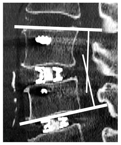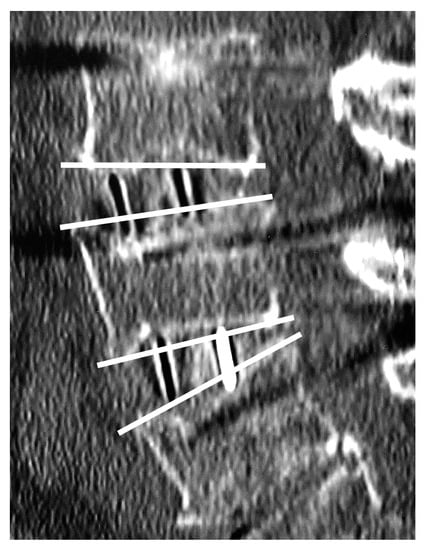 X-ray images were obtained in the standard standing position. CT images were taken using standard methods (Aquilion ONE Nature Edition, Canon, Tokyo, Japan; tube voltage 135 kV), and multiplanar reconstruction (MPR) images were produced. Postoperative CT images of patients who underwent staged surgeries were taken after both scheduled surgeries were completed. For spinal alignment, lumbar scoliosis (Cobb angle), pelvic incidence (PI), lumbar lordosis (LL), pelvic tilt (PT), and sagittal vertical axis (SVA) were measured. Each intervertebral lordotic angle was measured preoperatively and at 1 week and 3 months postoperatively by CT-MPR sagittal imaging. The intervertebral lordotic angle was defined for a positive value for lordosis (Figure 4).