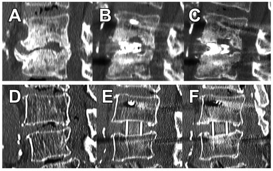 VEC was present in 2 (8.0%) levels for 3DTi vs. 17 (45%) levels for sPEEK (p = 0.002). There were no obvious fractures in either group. At 3 months postoperatively, no levels in the 3DTi group showed VEC progression (Figure 6A–C); however, eight (21%) levels in the sPEEK group showed VEC progression (Figure 6D–F) (p = 0.019). As a result, no levels in the 3DTi group and two (5.3%) levels in the sPEEK group were Marchi classification grade I. Grades II or III were not present in either group. There was also no cage dropout in either group.