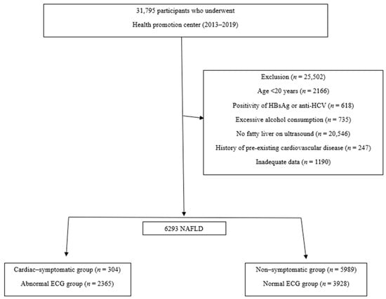 Between September 2013 and June 2019, 31,795 participants who underwent health screening evaluations at Yeungnam University Hospital Health Promotion Center were eligible for inclusion in this retrospective cross-sectional study. A total of 25,502 participants were excluded based on the following criteria: (1) age < 20 years (n = 2166); (2) positivity for HBsAg or anti-HCV (n = 618); (3) history of heavy drinking (males, >140 g/week; females, >70 g/week; n = 735); (4) no advanced evidence of fatty liver on abdominal ultrasound (n = 20,546); (5) history of pre-existing CVD (n = 247); and (6) inadequate or missing data (n = 1190). Therefore, a total of 6293 patients with NAFLD were enrolled in this study. The study protocol was approved by the Institutional Review Board of Yeungnam University Hospital (IRB No. 2020-03-027). The requirement for informed consent was waived because of the retrospective study design (Figure 1).