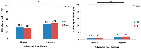 The percentage of ECG abnormalities was 35.1% in the absence of advanced fibrosis; 45.5% in the presence of advanced fibrosis, as defined by the NFS; 34.1% in the absence of advanced fibrosis; and 47.2% in the presence of advanced fibrosis, as defined by Fib-4 (p < 0.001). Moreover, the percentage of cardiac symptoms was 4.1% in the absence of advanced fibrosis; 7.3% in the presence of advanced fibrosis, as defined by NFS; 3.7% in the absence of advanced fibrosis; and 7.8% in the presence of advanced fibrosis, as defined by Fib-4 (p < 0.001; Figure 2).
