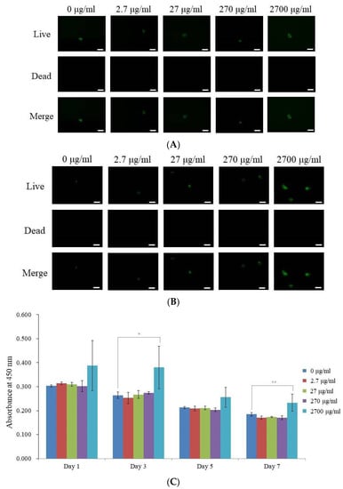 3.2. Determining the Vitality of Cells Qualitatively and Values in Numbers for Cellular Viability