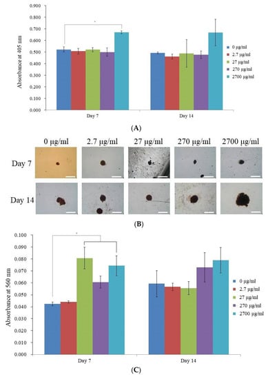 3.3. Analyzing the Activity of Alkaline Phosphatase with Alizarin Red S Staining
