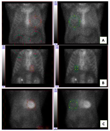 An example of planar PYP scan images of low, intermediate, and high uptake groups: (A) Low uptake with Heart/Contralateral lung (H/CL) ratio 1.1, (B) Intermediate uptake with H/CL ratio = 1.3, (C) High uptake with H/CL ratio = 2.0. Red: heart uptake, Green: contralateral lung uptake.