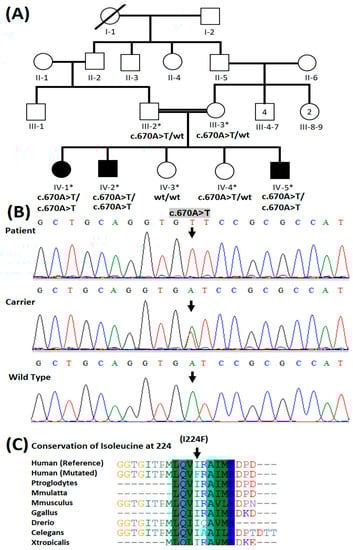 For the genetic study, 3–5 mL blood samples were collected from all available healthy and affected individuals of the family. DNA was extracted from the blood using a commercially available DNA extraction kit (QIAGEN, Germantown, MD, USA) following standard protocols.