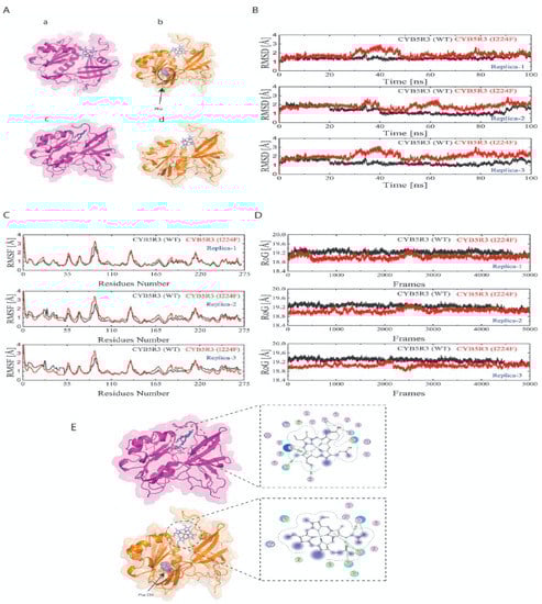 Heme established a significant number of hydrogen bond donor and acceptor interactions with the binding site residues of native CYB5R3. It was observed that in the case of wild-type Cys273, establishing two hydrogen donor and one hydrogen bond acceptor interactions, Thr181 contributes to one hydrogen bond donor interaction, while His117, Phe120, Tyr112 form H–pi and pi–pi interaction with the heme group. The interaction analysis of the mutant state of CYB5R3 reveals that Pro275, Pro276, and Tyr112 form one hydrogen bond acceptor with a docking score of −7.89. The findings of docking exposed that the point mutation at position 224 could significantly reduce the interaction of heme toward the CYB5R3. To gain deeper insights into the conformational changes inserted by point mutation, the docked complexes were subjected to 100 ns of MD simulations in triplicate.