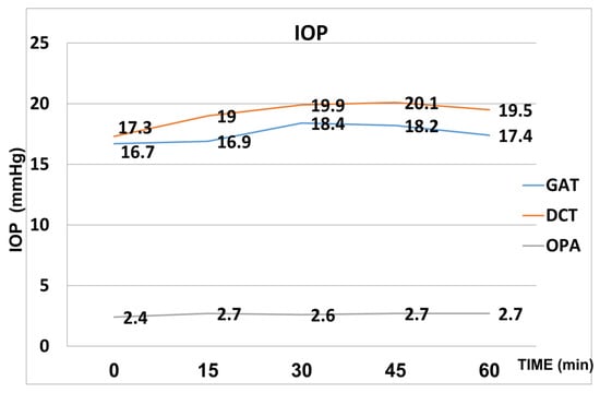 Mean ocular perfusion pressure increased from a baseline average value of 48.89 ± 5.73 mmHg to 53.51 ± 5.26 mmHg at 15′ and remained mostly stable until the 45′ time point. Finally, at the 60’ time point, MOPP started decreasing with an average value of 52.73 ± 5.71 mmHg.