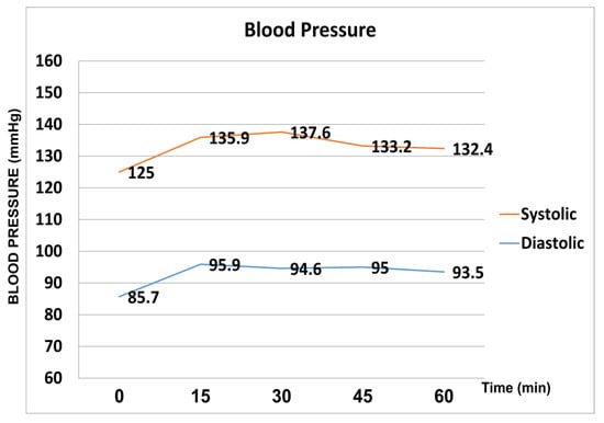 Mean arterial pressure was increased at a statistically significant level compared to baseline at each time point after the WDT. From an average baseline value of 99.66 ± 9.45 mmHg, MAP was 109.69 ± 8.68 mmHg at 15′, 108.98 ± 8.26 mmHg at 30′, 108.21 ± 10.27 mmHg at 45′, and 106.25 ± 6.29 mmHg at 60′ following the WDT.