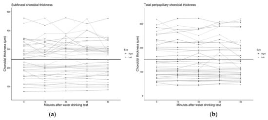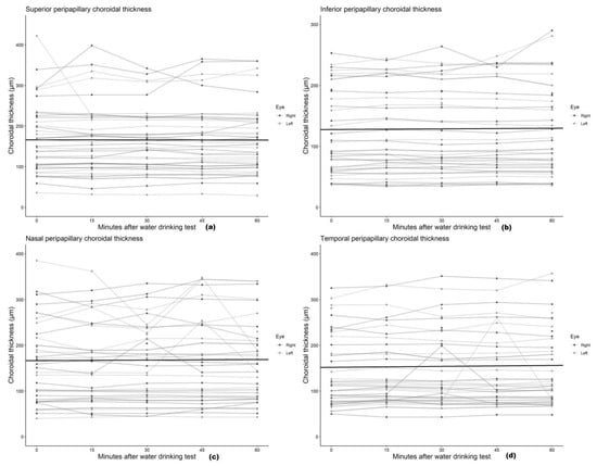 Finally, ChT was measured by two experienced technicians at baseline and at each time point following the WDT (15′, 30′, 45′, and 60′). As final measurement, the mean value of the two measurements was used. Subfoveal and peripapillary choroidal thickness were measured using Topcon automated OCT software. Peripapillary thickness consisted of four zones (superior, inferior, temporal, and nasal). The demarcation of the choroidal borders in each location was completely automated.