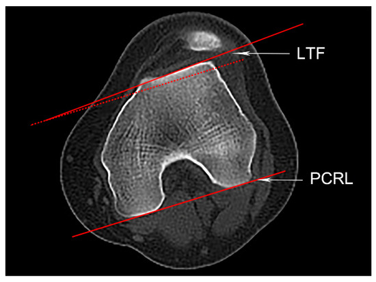 Lateral trochlea inclination (LTI). An axial slice showing an intact “Roman Arch” and the femoral condyles. The posterior condylar reference line (PCRL), its parallel line (the red dotted line), and a tangent line of the lateral trochlear facet (LTF) are shown. The LTI is defined as the angle between the PCRL and the LTF.