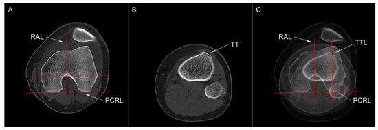 Referring to the method that we described previously, axial CT images were used to measure the TT-RA distance [10]. In short, the axial CT slice showing an intact Roman arch and the posterior femoral condyles was selected to mark the highest point of the Roman arch. The axial slice at the insertion of the patellar tendon was identified to determine the midpoint of the tibial tubercle. With the PCRL as the reference line, the distance between the highest point of the Roman arch and the midpoint of the tibial tubercle was measured to define the TT-RA distance (Figure 3).