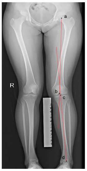 Hip–knee–ankle (HKA) angle measured by a weight-bearing full-leg radiograph. The points represent the center of the femoral head (a), the femoral condyles (b), the tibial plateau (c), and the ankle joint (d). It is the angle formed between the femoral axis (ab) and the tibial axis (cd).