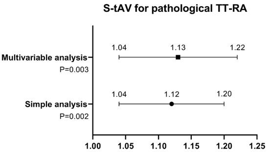 As shown by the results of the ROC curve analysis, S-tAV had a significant AUC of 0.711 for predicting a pathological TT-RA distance (p = 0.002), with a value of >18.6° indicating 54.8% sensitivity and 82.9% specificity. P-tAV had an AUC of 0.644 for a pathological TT-RA distance (p = 0.038) (Figure 5). S-tAV had an OR of 1.12 (95% CI [1.04, 1.20], p = 0.002) for predicting a pathological TT-RA distance by simple binary regression analysis. A multivariable analysis (the HKA angle and S-dAV were included) showed that S-tAV was associated with the TT-RA distance, with an OR of 1.13 (95% CI [1.04, 1.22], p = 0.003) (Figure 6).