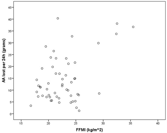 Relationship between the FFMI and AA lost. The x axis denotes the fat-free mass (FFMI) and the y axis denotes the amino acid (AA) lost per 24 h. The dots denote individual values.