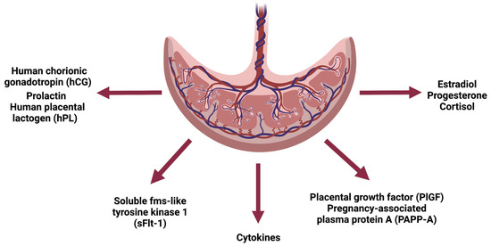 Schematic representation of the endocrine function of the placenta. Created with BioRender.com (accessed on 17 December 2022).