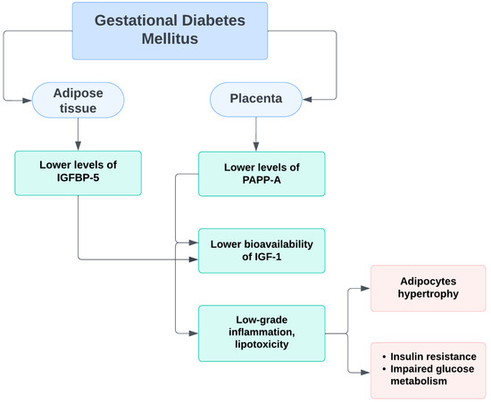 During a normal pregnancy, the induction of IGFBP-5 in adipose tissue increases the levels of sequestered IGF-1 and IGF-2, and PAPP-A degrades IGFBP-5, resulting in the release of insulin-like growth factors. This leads to angiogenesis and hyperplastic expansion of adipocytes. In women with GDM, insufficient IGFBP-5 levels and possibly decreased PAPP-A levels lead to reduced IGF bioavailability. Inadequate angiogenesis occurs, resulting in adipocytic hypertrophy and decreased capillary density. Low-grade inflammation and lipotoxicity are manifested, respectively, leading to further insulin resistance and impaired carbohydrate tolerance [38] (Figure 2).