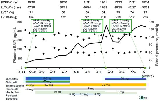 Combination therapy for PAH was performed using sildenafil, macitentan, and riociguat (Figure 1). However, plasma B-type natriuretic peptide (BNP) levels increased gradually together with the worsening of the dyspnea on exertion, categorized as the New York Heart Association function class II. Annual follow-up transthoracic echocardiography found gradually progressive myocardial hypertrophy. Considering suspected hypertensive cardiomyopathy, irbesartan was introduced (Figure 1). Three years ago, auto-antibodies regarding the Sjogren syndrome got negative without any specific interventions.