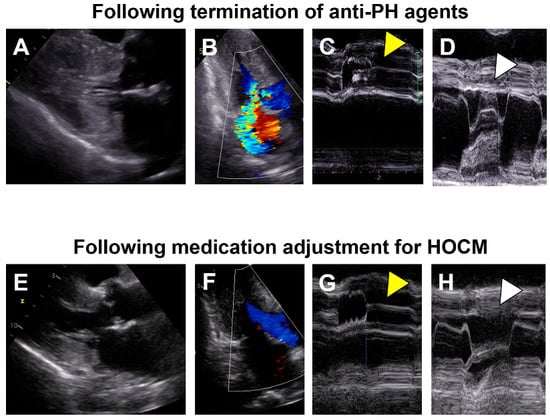 Transthoracic echocardiography images following termination of anti-PH agents (A–D) and those following medication adjustment for HOCM (E–H). (A) Diffuse left ventricular hypertrophy is obvious; (B) An accelerated blood flow in the left ventricular outflow tract with a Vmax of 3.4 m/s and moderate mitral regurgitation probably due to systolic anterior motion of the mitral valve; (C) Left ventricular outflow tract obstruction with aortic valve semi-closure (yellow arrow head); (D) Systolic anterior motion of the mitral valve (white arrow head); (E) Left ventricular hypertrophy got milder; (F) Neither obvious left ventricular outflow tract obstruction nor mitral regurgitation; (G) No obvious aortic valve semi-closure (yellow arrow head); (H) No obvious systolic anterior motion of the mitral valve (white arrow head). (A,B,E,F) were obtained at B-mode and others were obtained at M-mode. PH, pulmonary hypertension; HOCM, hypertensive obstructive cardiomyopathy.