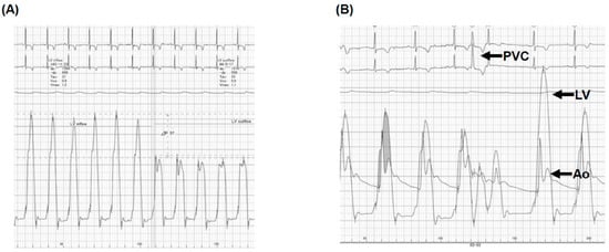 Right heart catheterization at rest (A) and at the time of Brockenbrough phenomenon (B). (A) At rest, the left ventricular pressure gradient was 56 mmHg; (B) At the time of the Brockenbrough phenomenon, a significant pressure gradient between LV and Ao, following the PVC, was observed. PVC, premature ventricular contraction; LV, left ventricle; Ao, aorta. (A) Right heart catheterization showed 56 mmHg of the resting left ventricular pressure gradient and (B) the Brockenbrough phenomenon, which is the significant gradient between the left ventricular (LV) and aortic pressure (Ao) on the beat post-PVC, was positive.