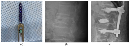 Figure 1. Fenestrated screws (a) Expedium VerseⓇ spinal system and Vertecem V+Ⓡ cement (DePuy Synthes Products, Inc., Raynham, MA, USA), (b) Case illustration: preoperative lumbar X-ray, 82-year-old man with L1 vertebral fracture pseudarthrosis in the osteoporotic spine (T= −2SD). (c) Case illustration: postoperative lumbar X-ray. L1vertebroplasty and T12-L2 posterior fusion with cement-augmented fenestrated screws was performed.