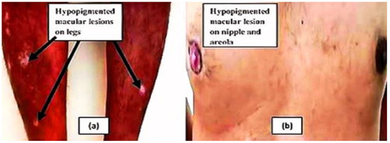 Vitiligo with multiple circular hypopigmented macular lesions on legs (a) and depigmented lesions on left nipple and areola (b).