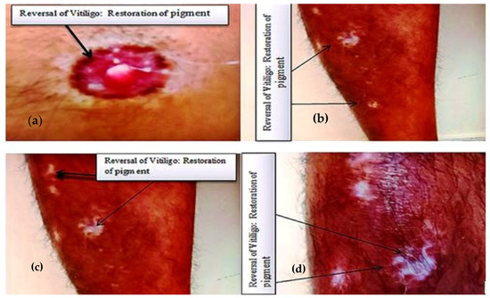 Macular lesions on nipple (a) and legs (b–d) showing restoration of melanin pigment, indicating reversal of vitiligo.