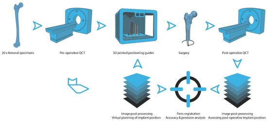 Graphical summary of the methodology: Twenty femoral anatomic specimens were scanned using a clinical QCT scanner. QCT images were postprocessed to create digital 3D bone models, define the optimal fixture (intramedullary component of the OPRA implant system) position and create specimen-specific positioning guides that were additively manufactured using a 3D printer. Following surgery, the specimens were QCT-scanned again and a postoperative digital 3D bone model of each specimen was created. In the last step, the 3D model pairs (pre- and postoperative) were registered and the deviation of the intraoperatively achieved implant position from the preoperatively planned implant position was analyzed. (Parts of the figure created with BioRender.com).
