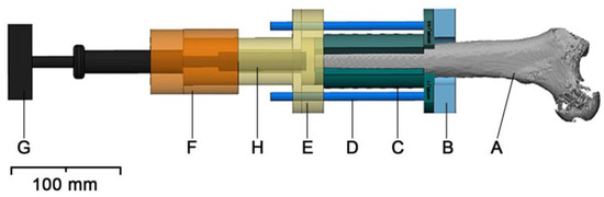 3-Matic Research 13.0 (Materialise NV, Leuven, Belgium) was used to design the specimen-specific positioning guides and experimental setup. The complete setup has been described previously [12]. Its most relevant parts are illustrated in Figure 2. In short, the designed positioning guides contained the specific negative impression of the 3D model of each femoral specimen. The impression was designed with an offset of 0.3 mm, accounting for underestimated bone tissue due to the partial volume effect (PVE) in the QCT imaging series and residual soft tissue. had a total length of 100 mm and an outer diameter of 40.0 mm. Each cylindric guide was designed to be concentric with the 18.0 mm diameter fixture within the medullary cavity. To achieve an optimal fixture position, a preoperative plan, considering the anatomy of the medullary cavity as well as the outer specimen contour, was designed. Not only was it necessary to center the fixture within the medullary cavity, but a minimum of 2.0 mm bone cortex also had to be maintained to achieve maximum implant stability [14]. Once designed, each guide was divided into two parts to facilitate the positioning along the specimens’ medial and lateral contours covering a total of two-thirds (67%) of the specimens’ circumference. Using a designed general positioning guide template which required only the adaptation of its inner surface to match the specimen-specific contour, it was possible to create the 3D model of the specimen and design the specific guide in less than 1.5 h.