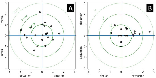 The means of the abduction/adduction and extension/flexion angle as well as the medial/lateral and anterior/posterior axis offset stayed well below 1° and 1 mm, respectively. The deviations of the outcome variables from the intraoperatively planned fixture position are presented in Table 2 and displayed in Figure 3.