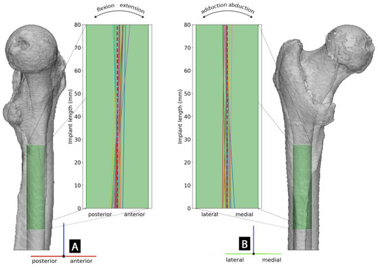 Visualization of the preoperatively planned fixture position (in a left femur) represented by the green cylinder in the 3D model and deviations of operatively achieved final fixture axis for each specimen in the corresponding 18.0 × 80 mm fixture projection in (A) lateral and (B) anterior-posterior view. The dashed red line represents the preoperatively defined fixture axis.